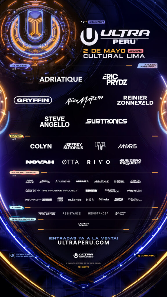 Estas nuevas incorporaciones se suman a los headliners previamente confirmados para ULTRA Peru 2026: Steve Angello, Eric Prydz, Gryffin, Adriatique, Nico Moreno y Subtronics, así como a los actos de soporte Colyn, Level Up, NOVAH y Sub Zero Project.