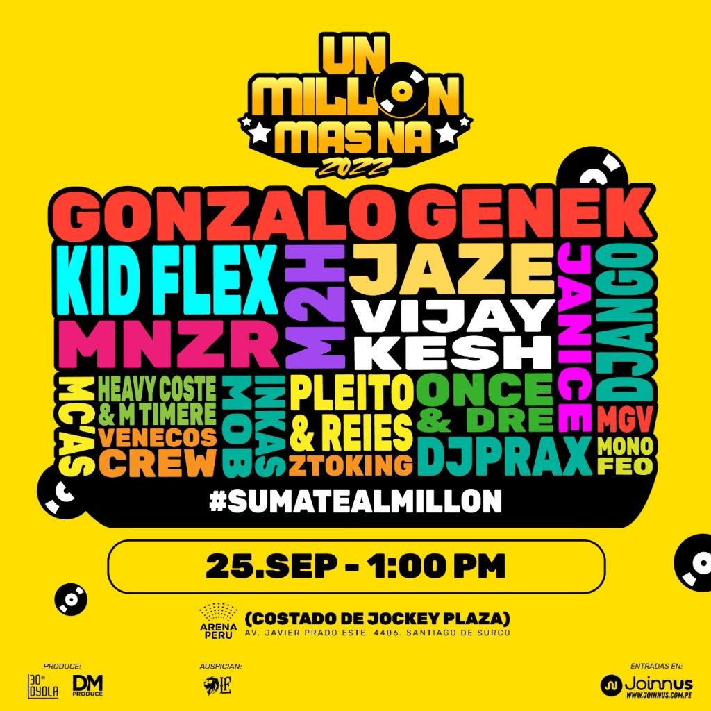 De igual manera, el escenario del ‘Un Millón Más Na 2022’ tendrá las participaciones de Vijay Kesh, MC’AS, Django, Mono Feo, El Trucha, MGV, Venecos Crew, entre otros nombres de la escena local.