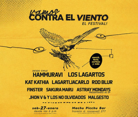 La primera edición del Festival Vamos contra el viento, reúne una diversidad de artistas del indie rock y el urbano electrónico, encabezado por la banda chilena Hammuravi en su primera visita a nuestro país. El festival, producido por Pudín Crew, se realizará este sábado 27 de enero en Machu Picchu Bar.Estarán Los Lagartos, Kat Kathia, Lagartijacarlo, Rod Blur, Finster, Sakura Maru, Astray Mondays, Jhon V y los no olvidados y Malgesto.