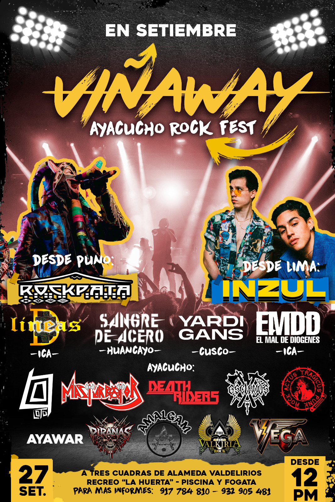 Con más de una docena de bandas en escena, el Viñaway Ayacucho Rock Fest busca convertirse en un referente para el intercambio cultural y musical de la región, creando un espacio donde confluyen las distintas expresiones del rock peruano. La cita es el sábado 27 de septiembre, desde las 12 del mediodía, en el recreo La Huerta (a tres cuadras de la Alameda Valdelirios, Ayacucho). Informes: 917 784 810 – 932 905 481.