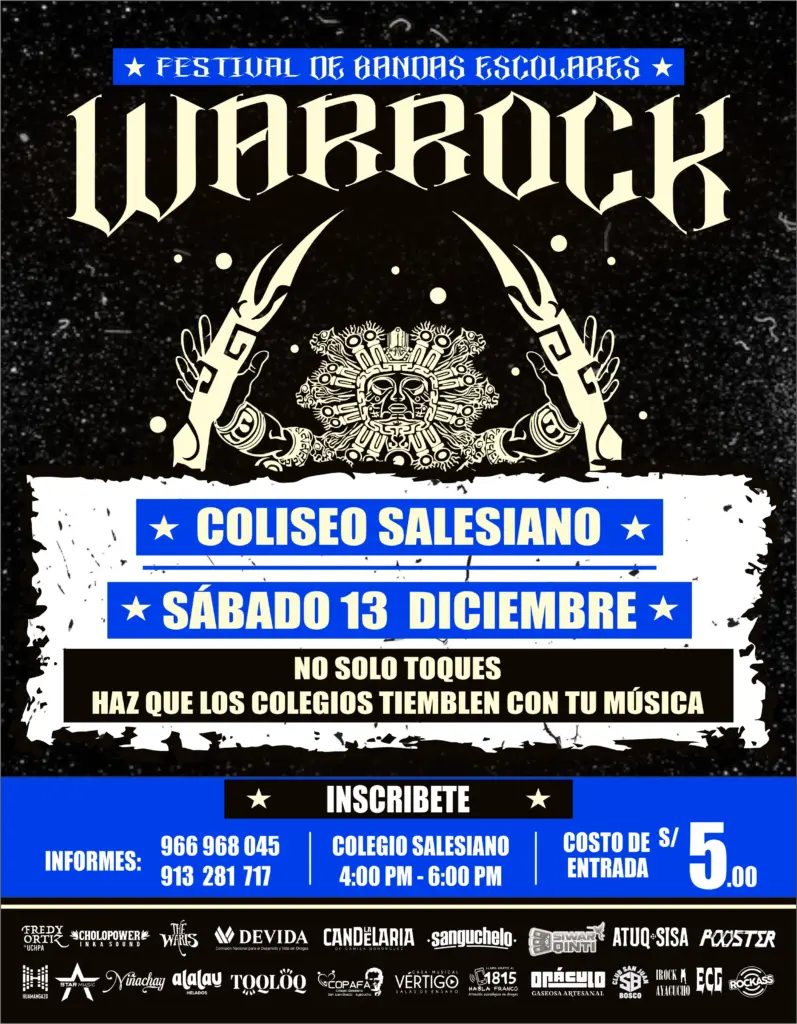 WarRock se prepara para abrir sus puertas este 13 de diciembre como el primer concurso interescolar de bandas escolares de rock en Ayacucho, una iniciativa que nace con el objetivo de brindar a los estudiantes un espacio seguro, motivador y profesional donde puedan mostrar lo que saben hacer sobre el escenario. La organización, a cargo del Municipio Escolar 2025 del Colegio Salesiano San Juan Bosco, destaca que el evento busca unir a jóvenes de distintos colegios a través de la música y la creatividad.