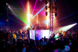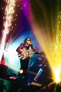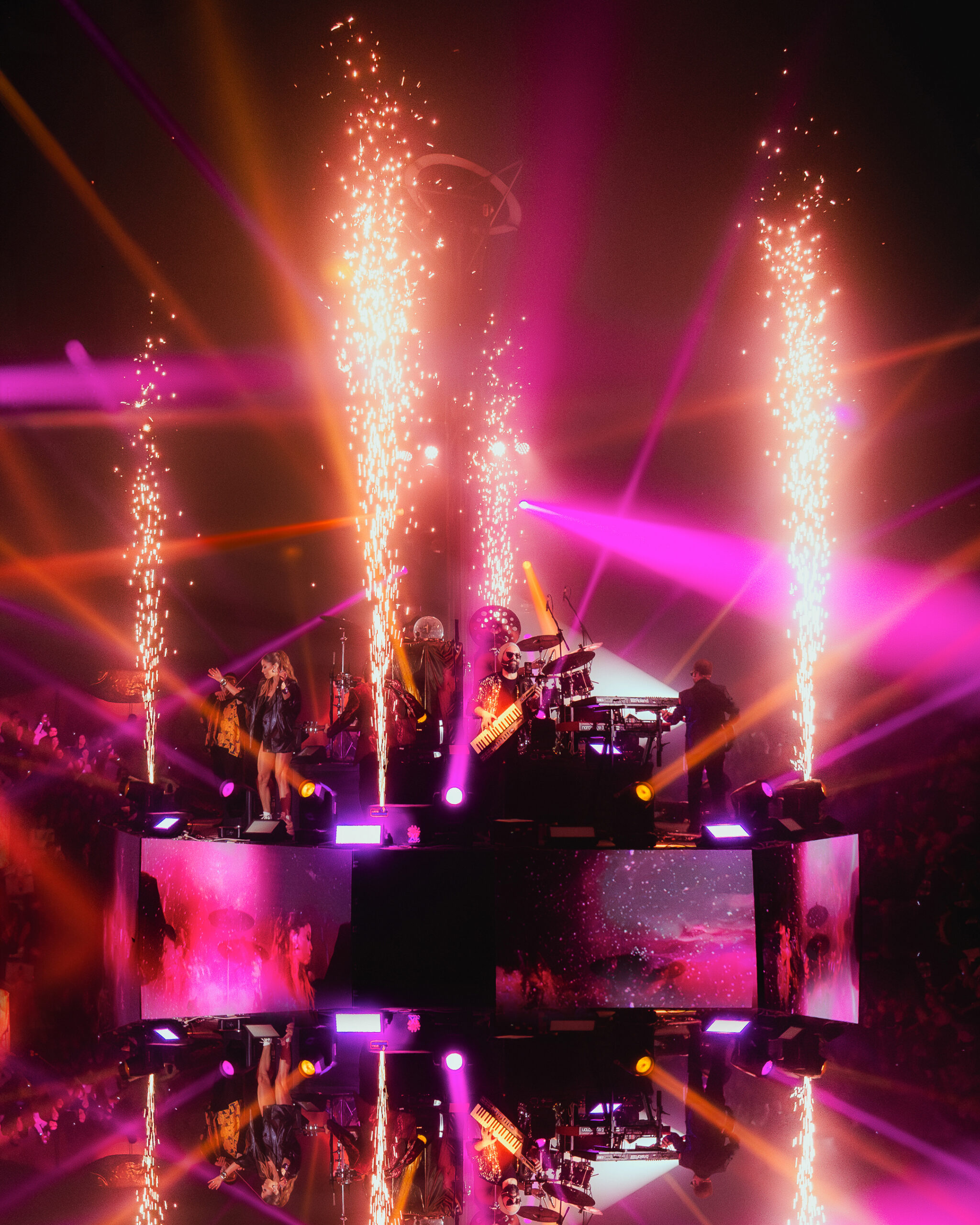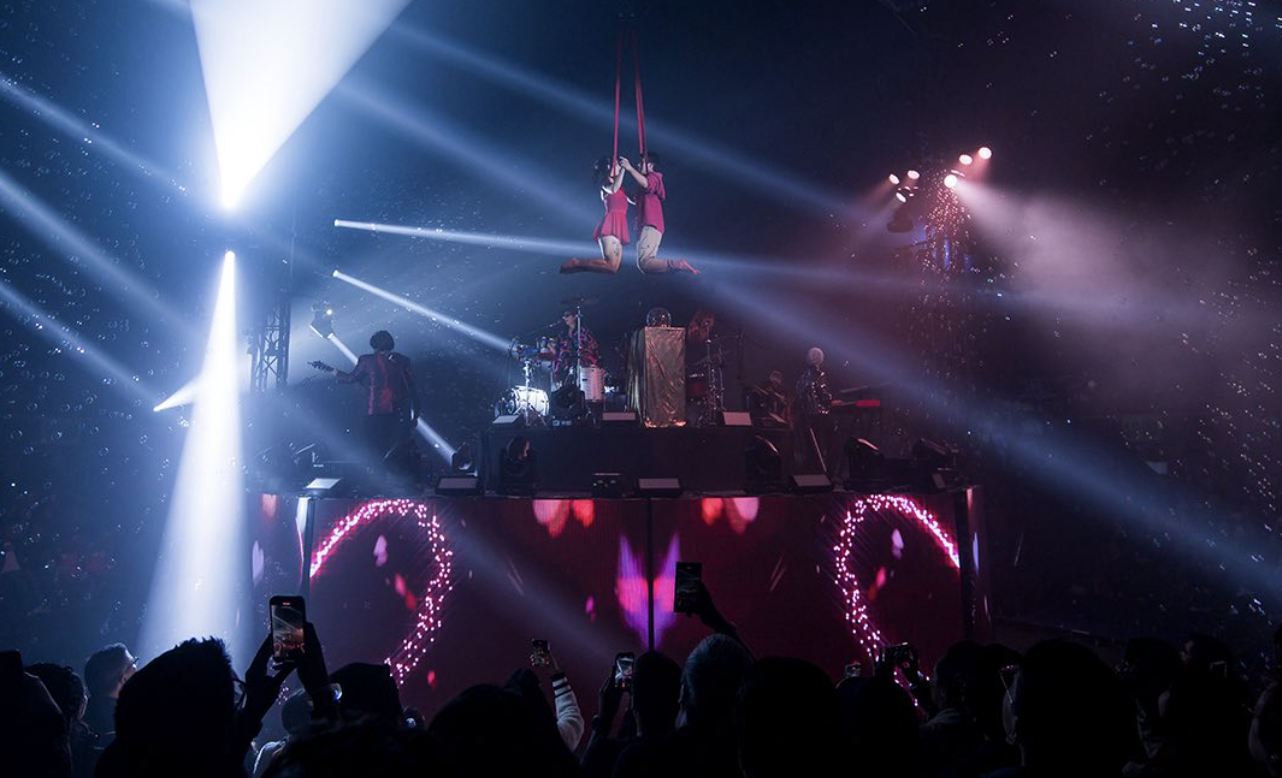 El escenario, ubicado en el centro de la carpa, permitió una disposición 360° que rompió barreras entre los espectadores y la banda, quienes bajaron del escenario en diversas oportunidades para fundirse entre el público. Este formato envolvente fue clave para la conexión emocional que se generó durante el espectáculo. Luces, lásers, acrobacias aéreas, baile, actuaciones y visuales sincronizadas transformaron cada canción en una pieza escénica cargada de intención y simbolismo. Adicionalmente, efectos especiales como fuego, CO2, humo y burbujas, elevaron el show a una experiencia a las que solo nos tienen acostumbrados los parques temáticos de Orlando, reafirmando la calidad internacional de la banda y el concepto multisensorial del evento.