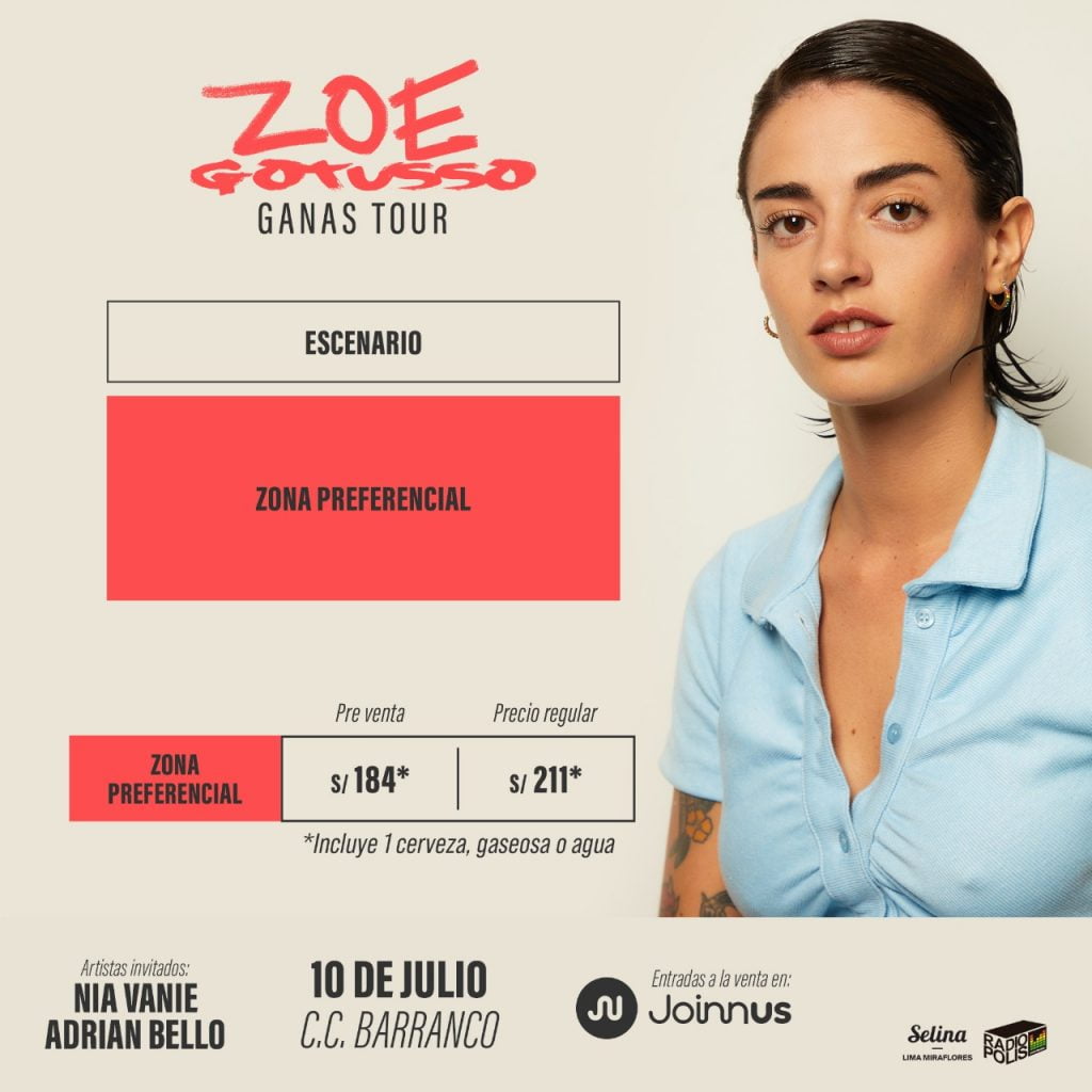 Después de varios esfuerzos, Zoe acaba de anunciar su esperada gira, ‘Ganas Tour’ la cual tiene programados 60 conciertos en países como España, Colombia, México y, por supuesto, Perú. Radiopolis, promotora del concierto, confirmó que su esperado show en Lima será este 10 de julio en el C.C. de Barranco. Las entradas ya pueden ser adquiridas directamente en la plataforma digital de Joinnus.